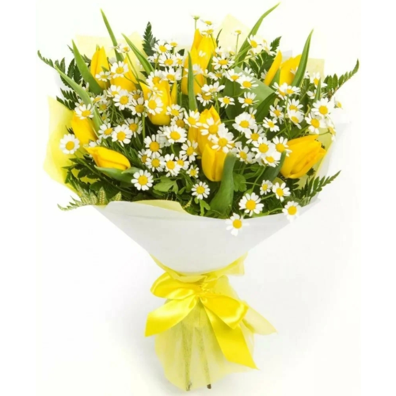 Букет состоит из 11 желтых тюльпанов, 4 ветки танацетума, зелень, красивая упаковка, атласная лента.