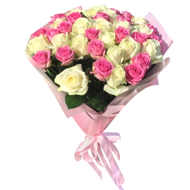 Букет состоит из 23 розовые розы, 22 белые розы, красивая упаковка, атласная лента.