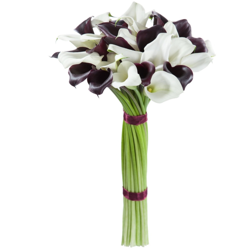 Букет состоит из MIX из 25 белой и черной каллы, прозрачная упаковка, атласная лента.